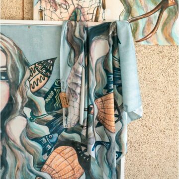 También disponible en prenda de arte como pañuelo de dimensiones 100x100cm. Serigrafías textiles firmadas y numeradas de una tirada de 50 ejemplares.